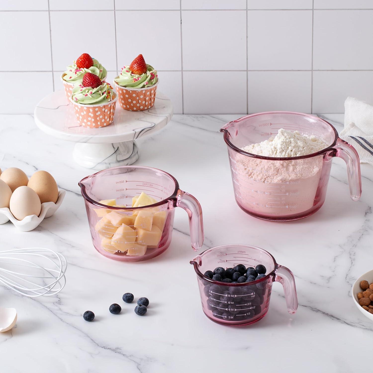 Durable Glass Measuring Cup Set: This product offers a 3 piece measuring cup set, perfect for all your cooking and baking needs. Made of high-quality colored glass, these liquid measuring cups are a must-have in every kitchen.