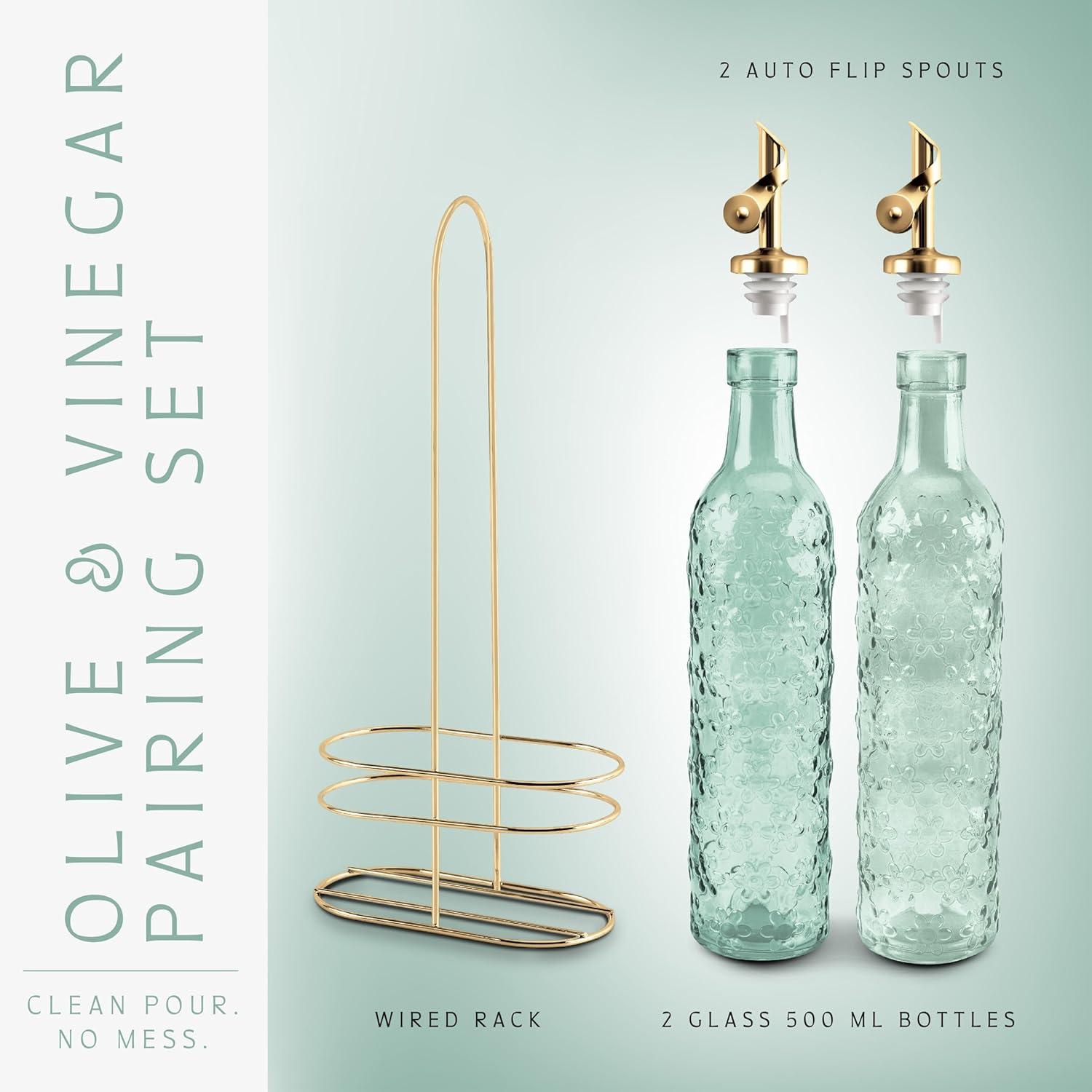 Beautiful and Functional – Our colored glass oil dispensing bottles, with elegeant colors, gold tops and gold wire rack, will elevate your kitchen. Don't use just any oil bottle, upgrade the way you cook. That's our mission.