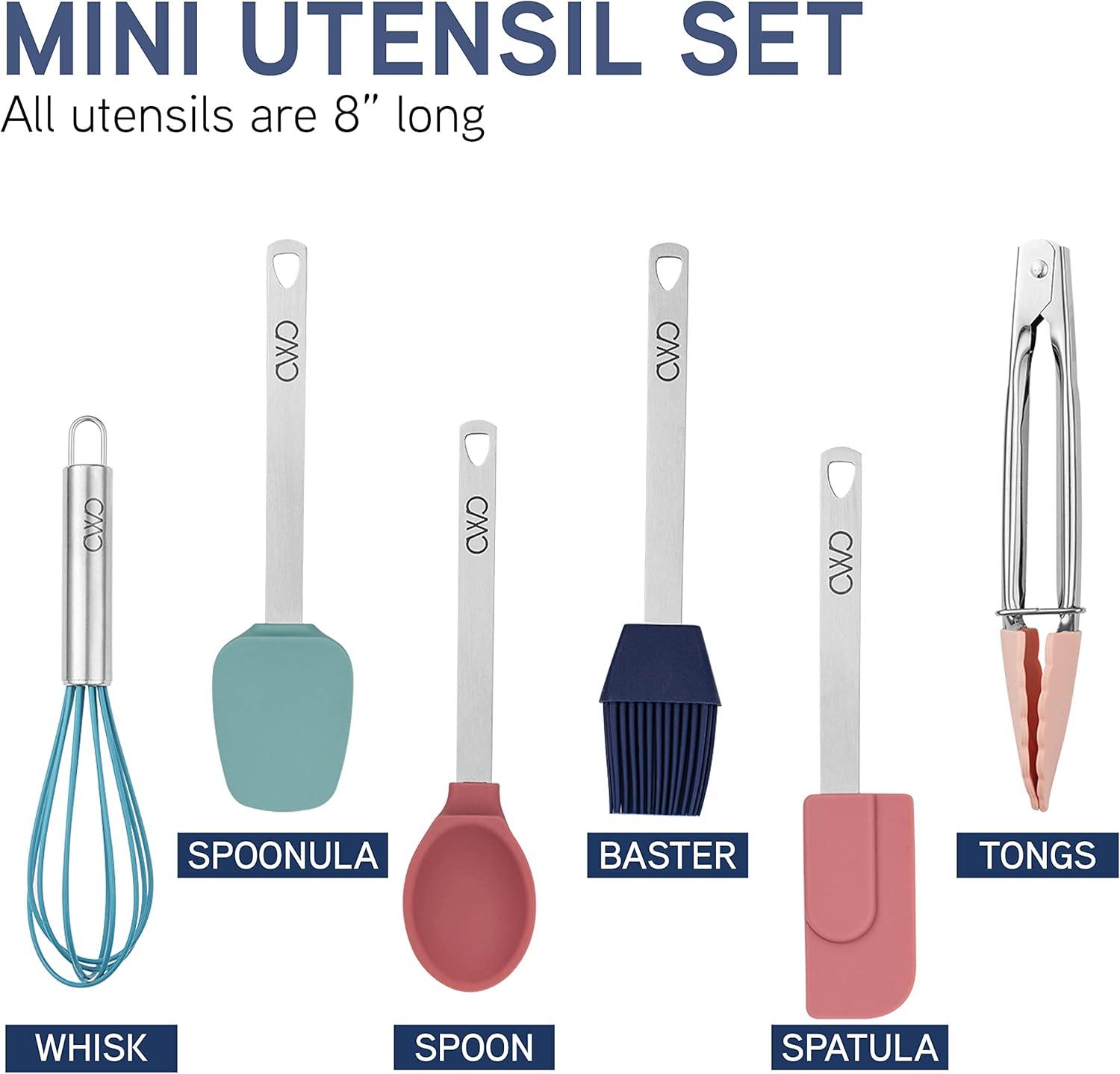 MINI SET INCLUDES – This adorable set includes mini silicone whisk, mini silicone spoonula, mini silicone spoon, mini silicone basting brush, mini silicone spatula and mini silicone tipped tongs.
