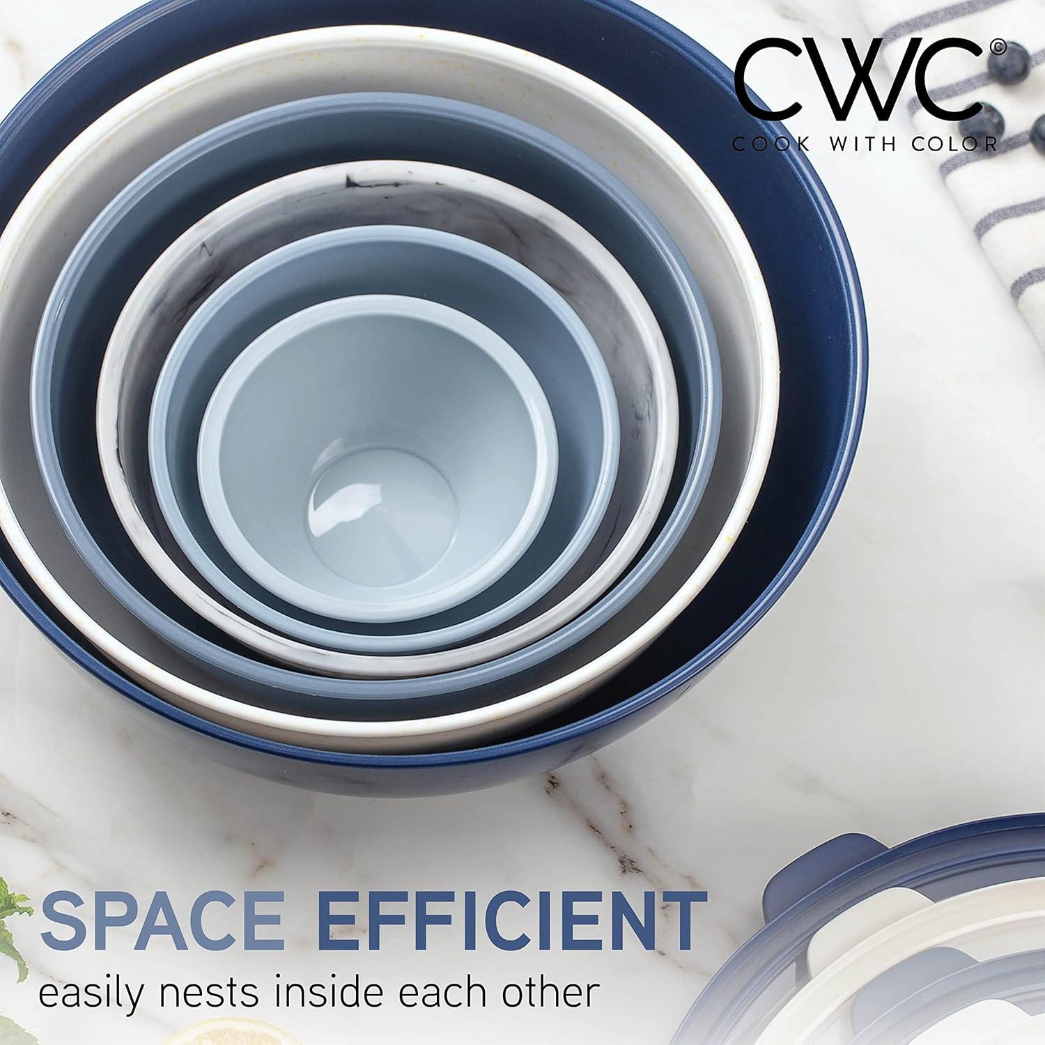 COOK WITH COLOR Nesting Mixing Bowls – 12 Piece Plastic Bowl Set with Lids, Microwave Safe (Green)(Blue and White TPR Lids)