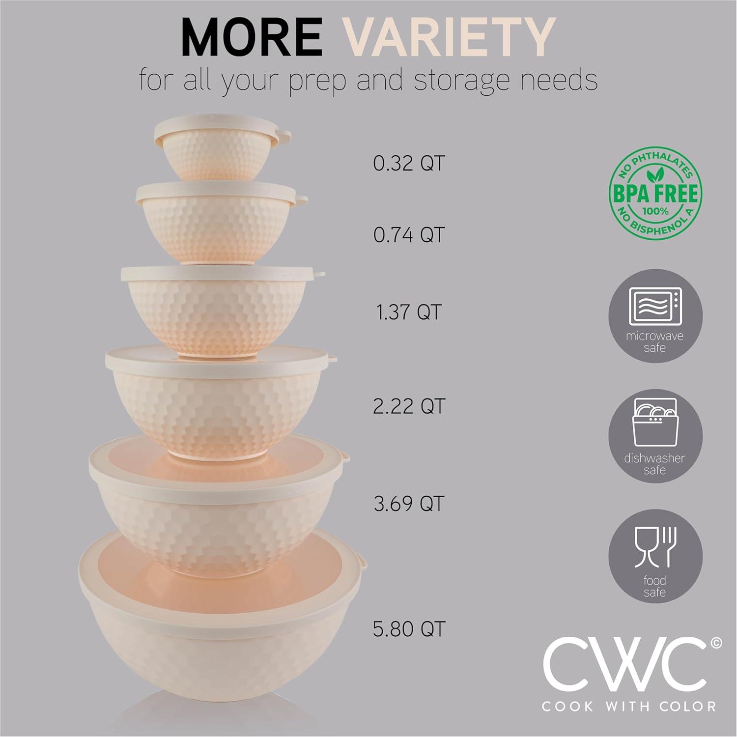 Set includes 6 plastic bowls and 6 TPR lids; Bowl capacity of 0.32 QT, 0.74 QT, 1.37 QT, 3.69 QT and 5.8 QT.