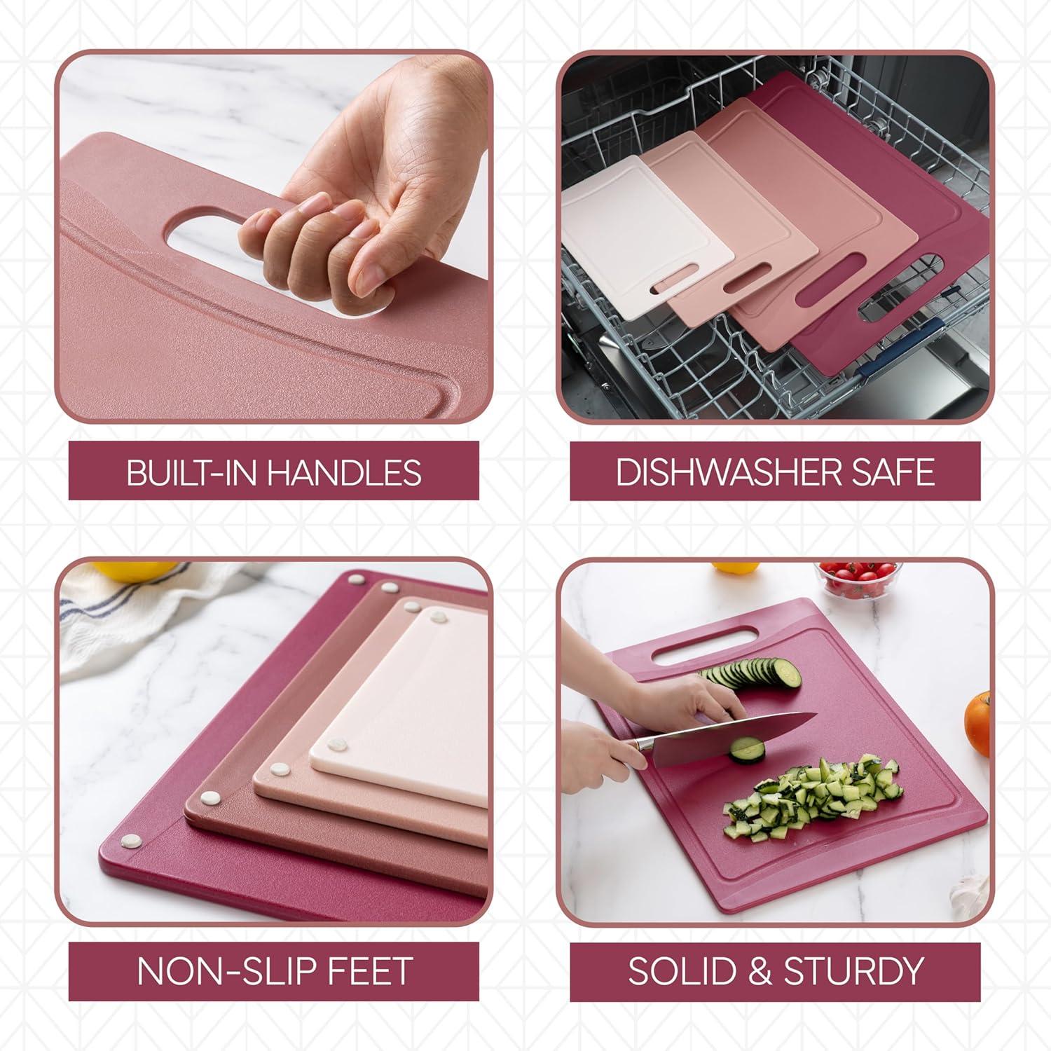 DIFFERENT SIZE OPTIONS – From slicing meat to chopping grapes, this plastic cutting board set comes with a the great size board for your kitchen needs. The largest measures: 14″, medium: 12″, and small: 9.5″.