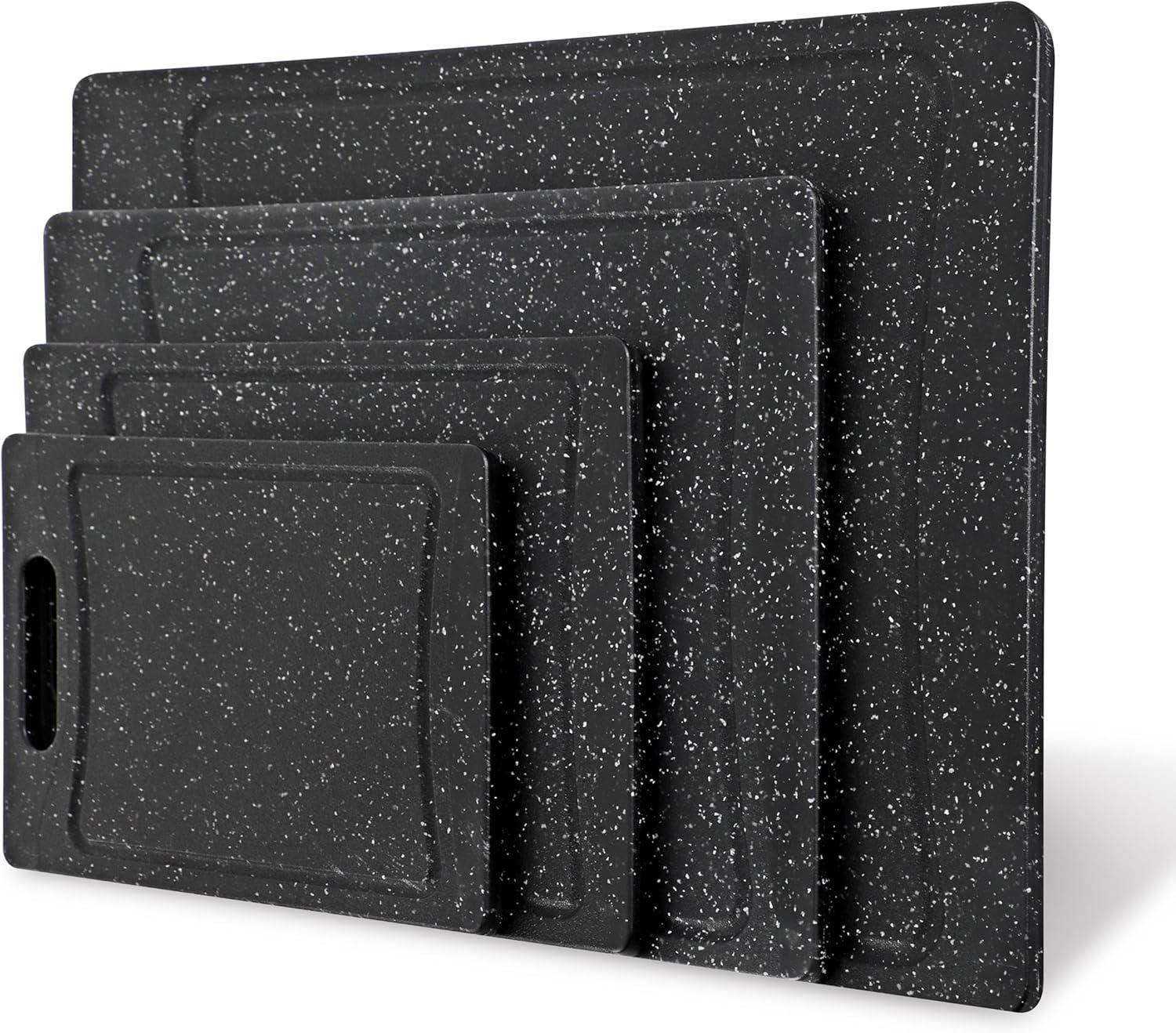DIFFERENT SIZE OPTIONS – From slicing meat to chopping grapes, this plastic cutting board set comes with a the great size board for your kitchen needs. The largest measures: 17″, large: 14″, medium: 12″, and small: 9.5″.
