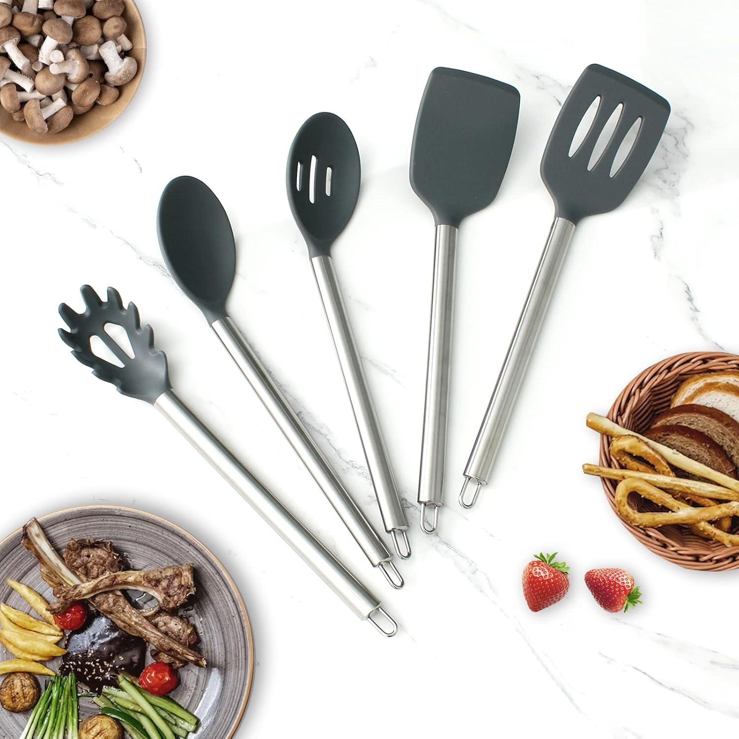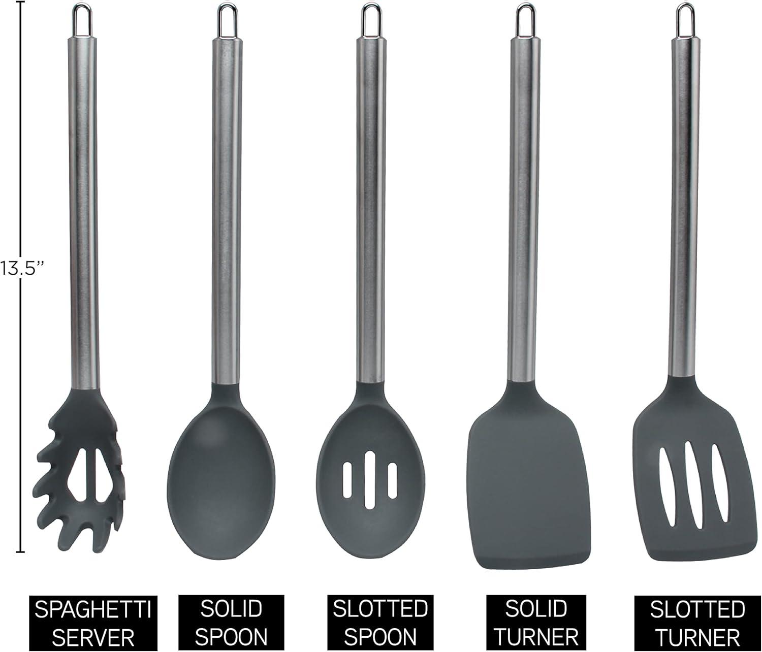 Set includes 1 serving and mixing spoon, 1 slotted spoon, 1 turner, 1 slotted turner and 1 spaghetti spoon; a completely functional set that will cover all your basic kitchen needs from stirring, frying, and tasting to serving. Heat resistant up to 500° F.