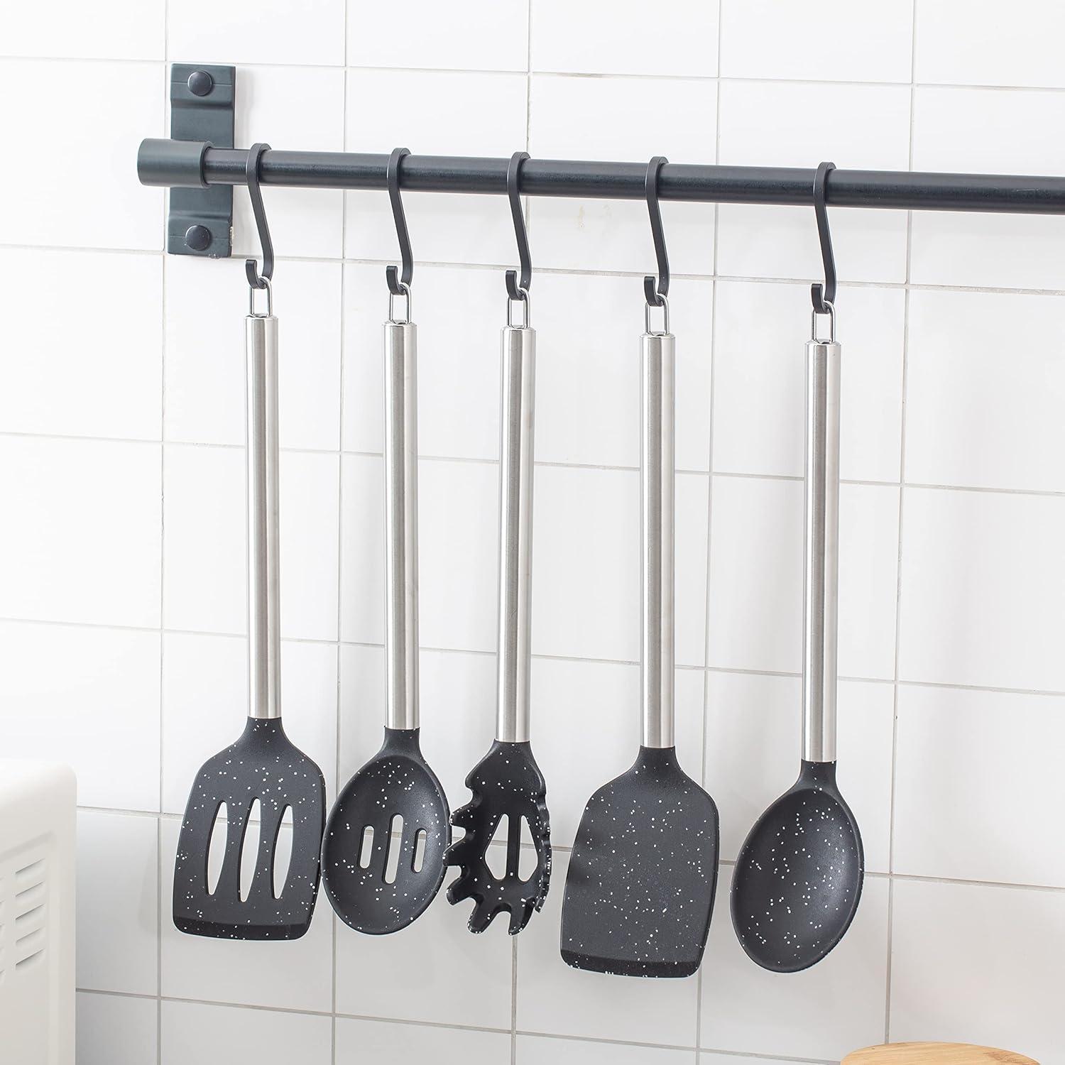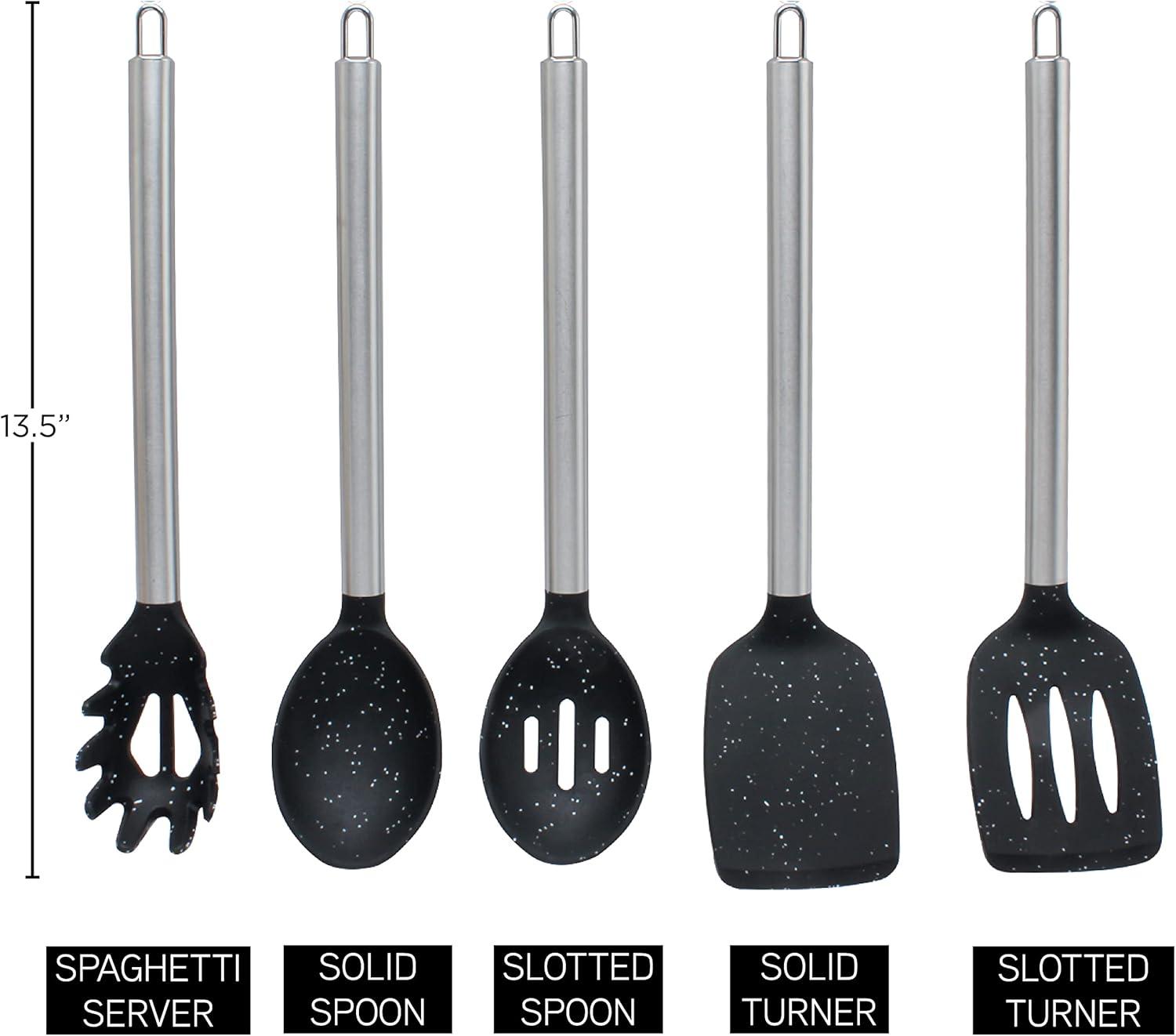 Set includes 1 serving and mixing spoon, 1 slotted spoon, 1 turner, 1 slotted turner and 1 spaghetti spoon; a completely functional set that will cover all your basic kitchen needs from stirring, frying, and tasting to serving. Heat resistant up to 500° F.