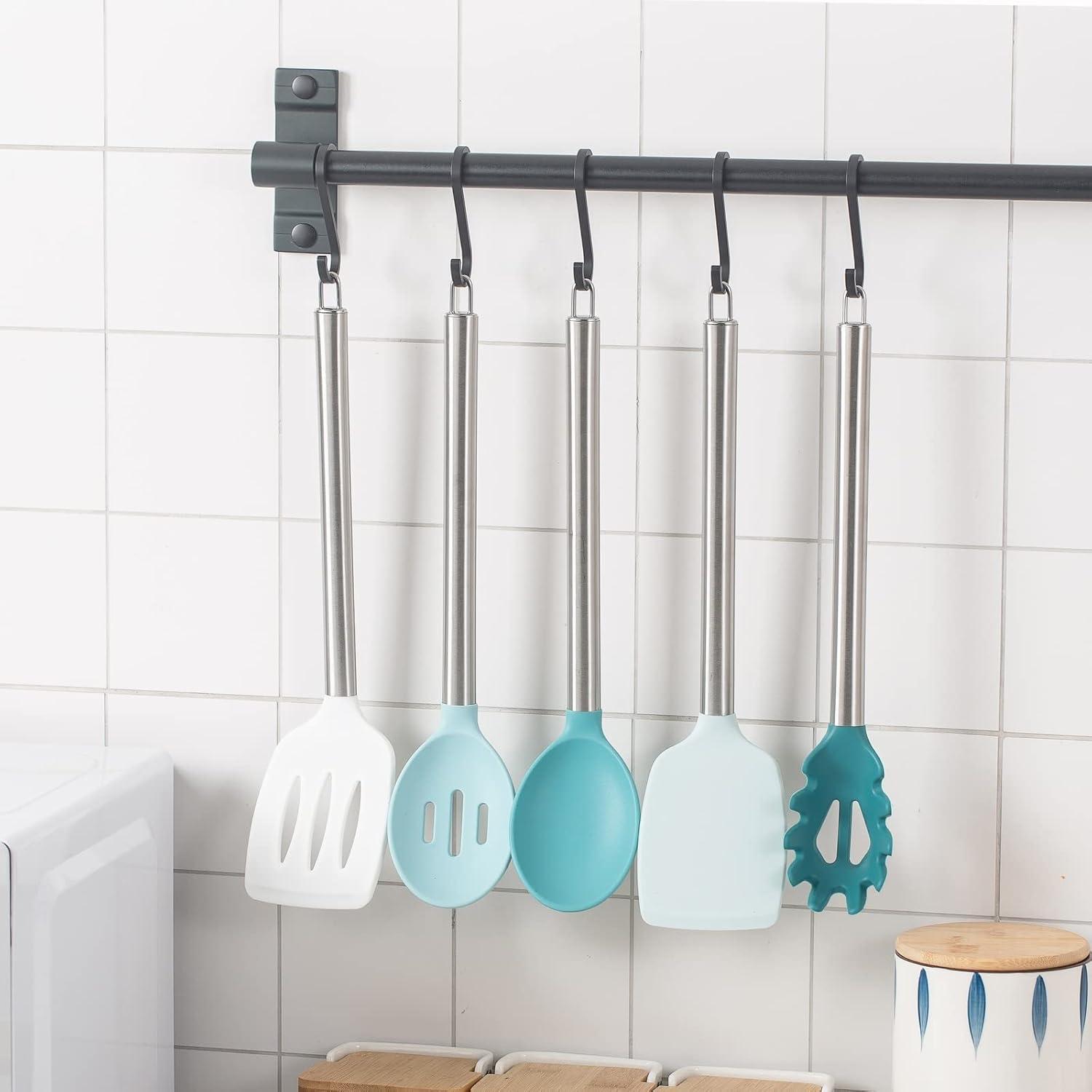 Blue ombre utensil set with metallic tones, this set of silicone kitchen tools has an up to date, trendy look that is madly in line with the current styles and trends. Add a splash of color and funk to your kitchen and hang from the rings on each utensil.