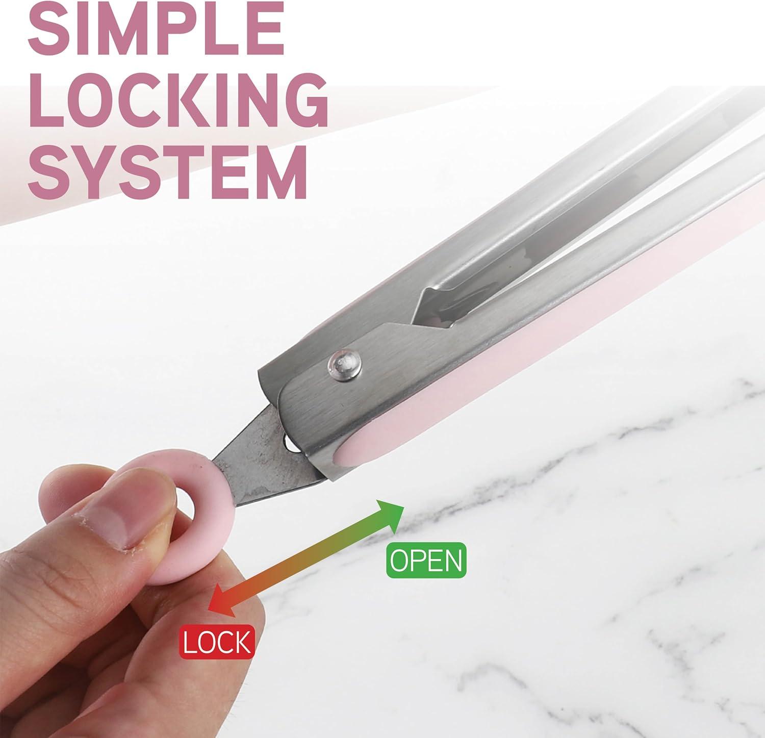 Food contact safe and designed with your safety in mind to prevent burns and avoid harmful stuff. Features a firm locking feature that is user friendly, simply pull the secure locking ring outwards and hang from the loop for storage.